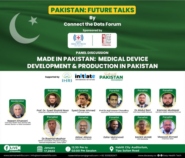 The Samane Shifa Foundation and Easy Health Tech collaborated to organize a panel conference dedicated to the Development and Production of Medical Devices in Pakistan on January 17th, 2024, at Habit City, Karachi.