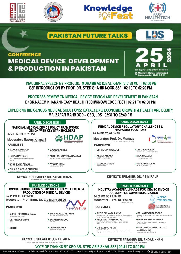 Samane Shifa Foundation (SSF) in collaboration with Easy Health Tech Pvt. Ltd (EHTPL) is organising 2nd Annual conference on “Boosting Medical Devices in Pakistan” on 20th October, 2023 at the Expo Center, Karachi.